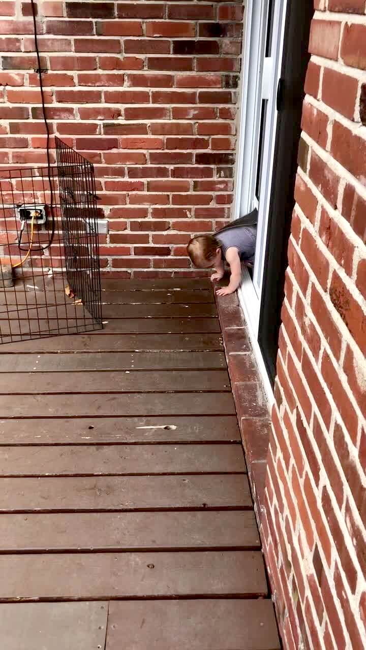 A baby girl falls on the patio when a french bulldog dog knocks her over as she crawls through a pet door.