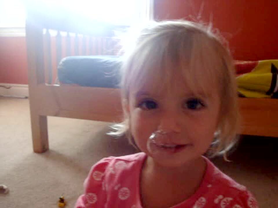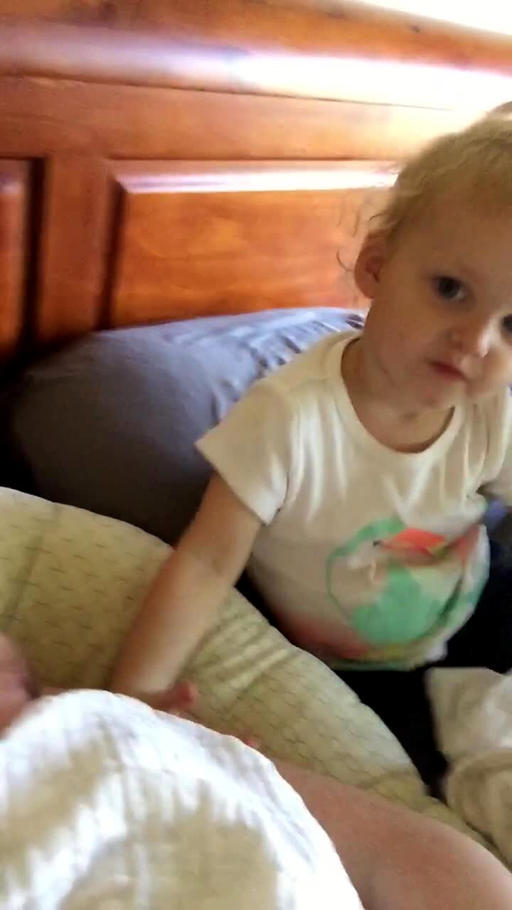 A tot girl hugs her new baby brother indoors before she sneezes into her hand, looks around, then wipes it on the baby.