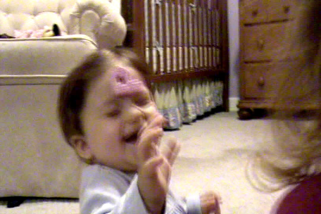 A baby boy laughs each time his dad spits his pacifier at the baby until he spits it out and it goes directly into the baby's mouth.