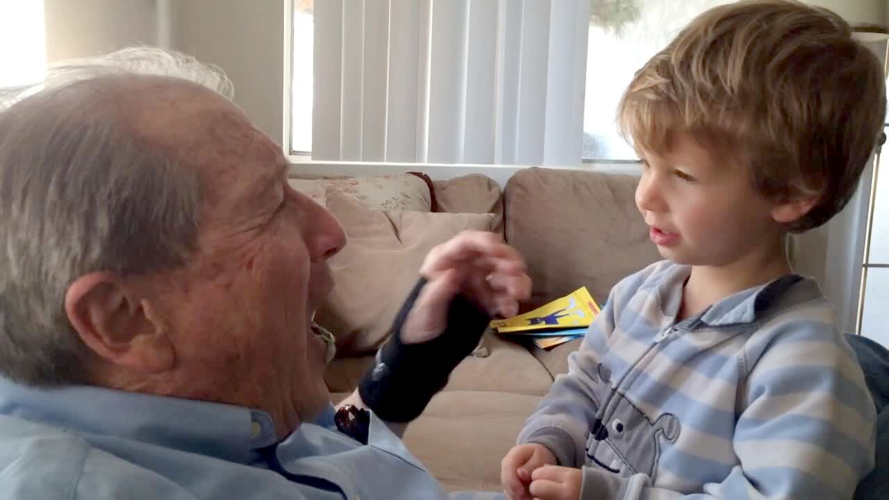 A senior man blows a bubble in his gum and his tot grandson smacks his face to pop it.
