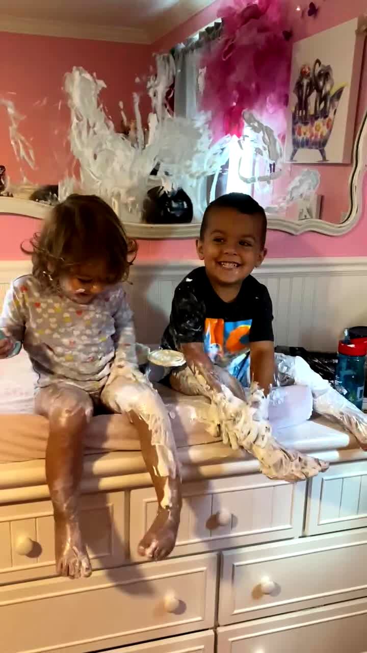 A woman finds a tot boy and girl in a bedroom with a huge mess of toys on the floor and paste all over their bodies. She yells at them and they laugh.