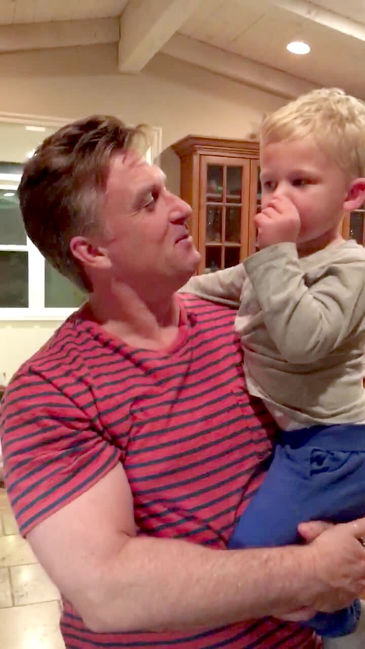 A man and his tot son wish the man's mother a happy birthday with a video and the boy picks his nose the whole time.
