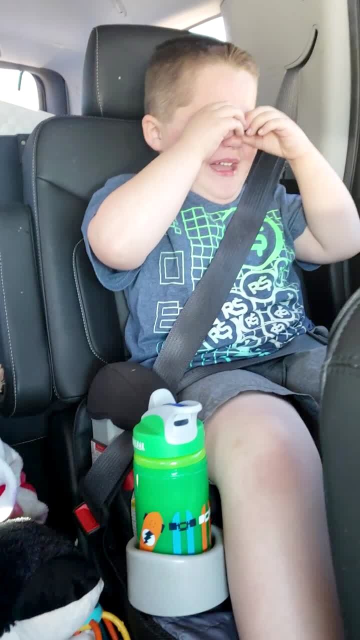 A boy tot cries in the back seat of a car when he finds out that he's going on a surprise trip to Disney World. He says he rather stay home and the woman behind the camera is surprised by his reaction.