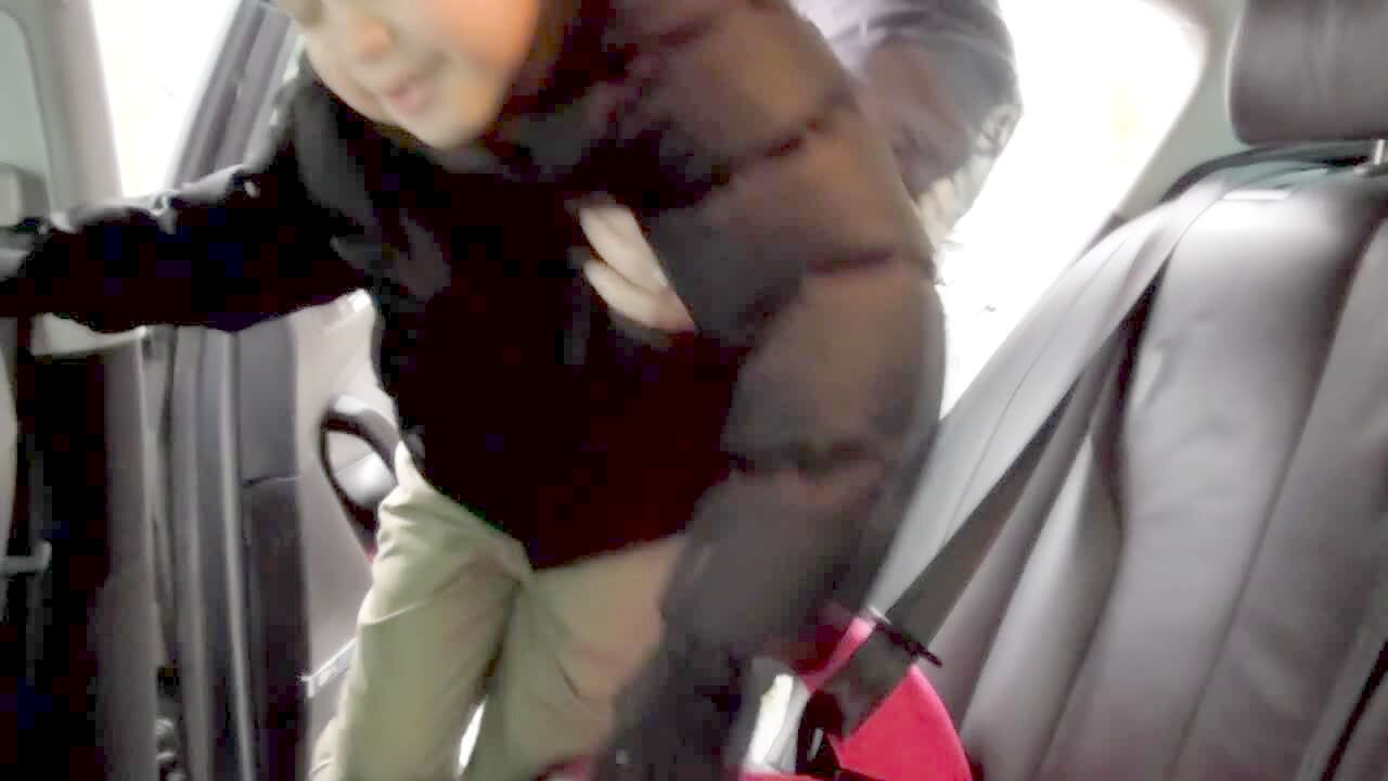 "Baby's First Convertible" Baby boy stands on the driver's seat of car & pretends to drive. Mom tries to take boy out, he won't let go of steering wheel & cries.