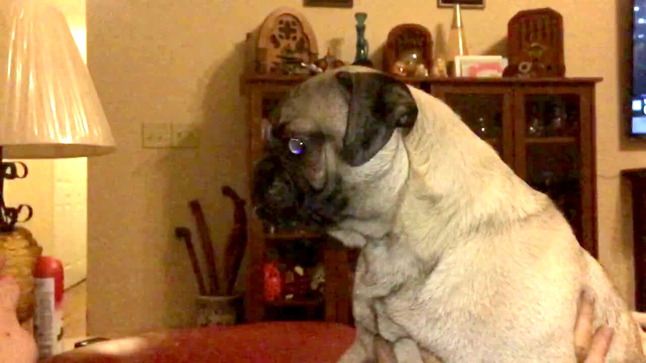 A pug dog licks its lips in slow motion with a long tongue at home.