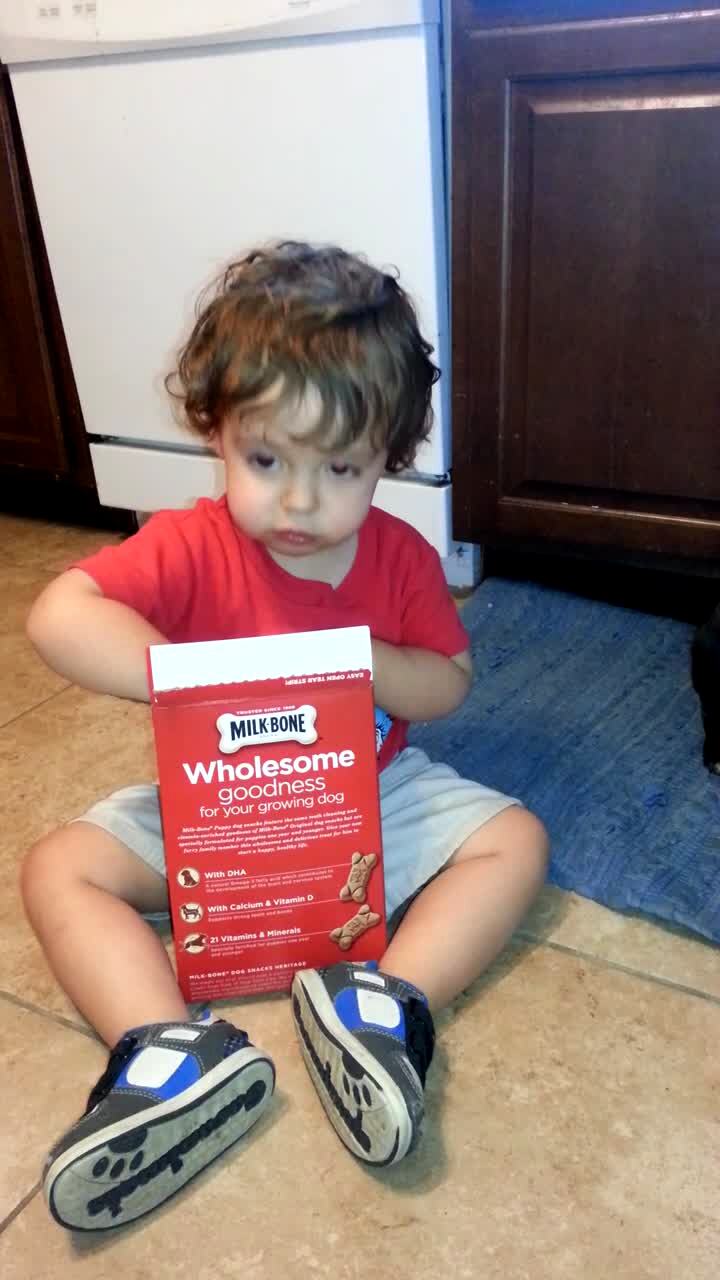 A tot boy eats dog treats out of a box and feeds some to a small dog next to him indoors.