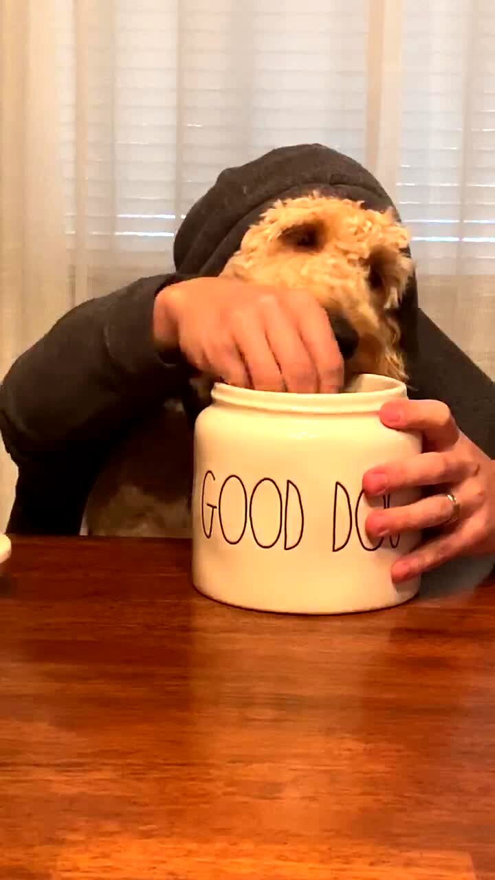 A dog with human hands eats dog cookies from a jar at a kitchen table.