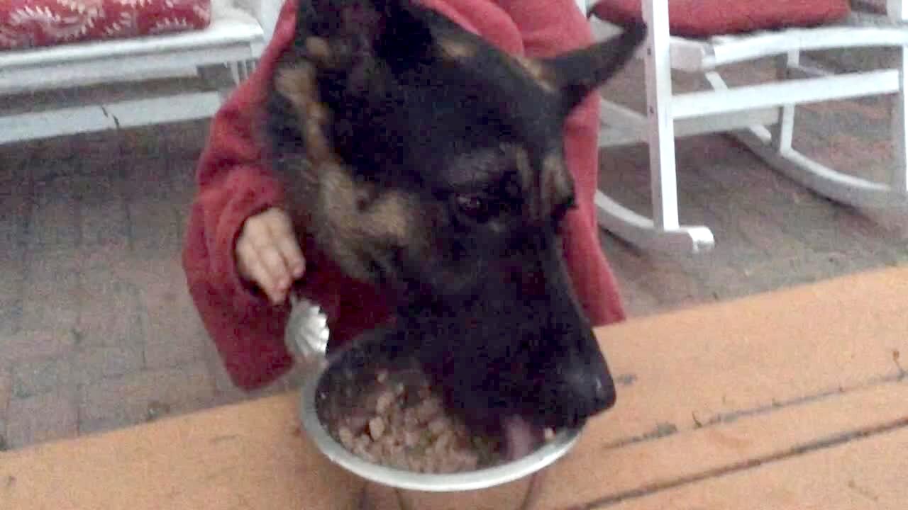 A German Shepherd dog eats a bowl of dog food with human hands at a table in a yard.