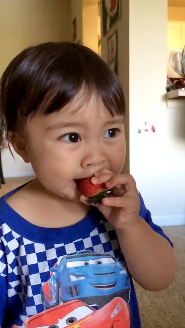 A tot boy eats a strawberry in slow motion at home and makes a sour face, sticking his tongue out.