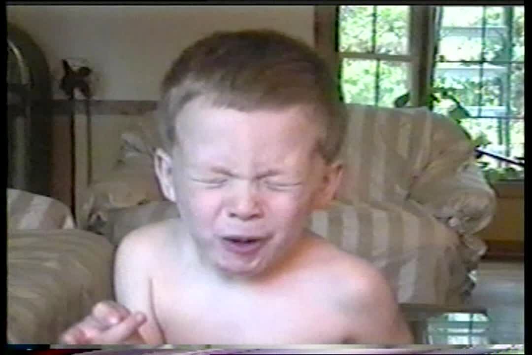 A tot boy takes a sip of lemon juice in the kitchen and gags and then he whimpers as he walks out of the room.