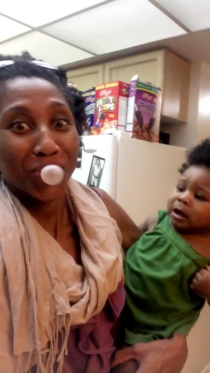 A baby girl screams and recoils when her mother blows a bubblegum bubble at home. scare.