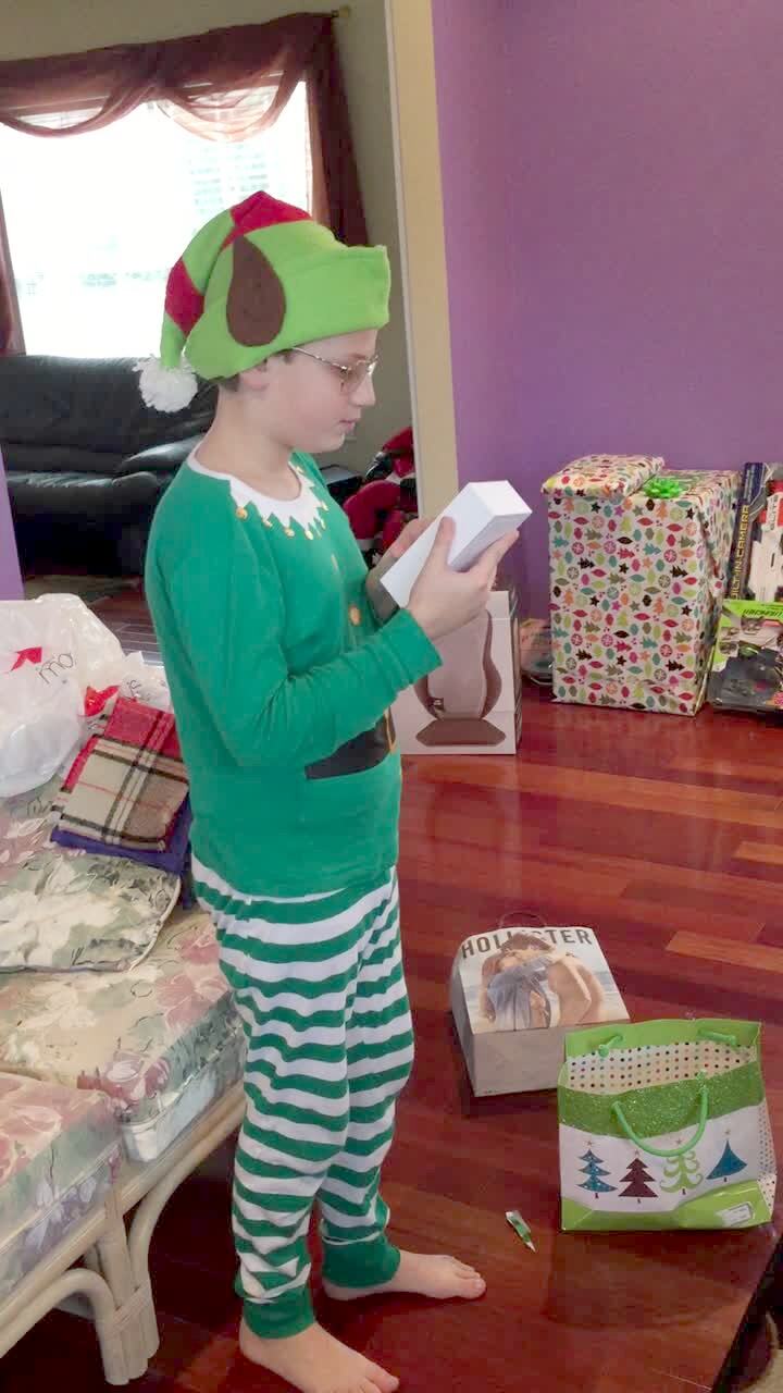 A boy turns on a dryer hose in his face in slow motion indoors.
