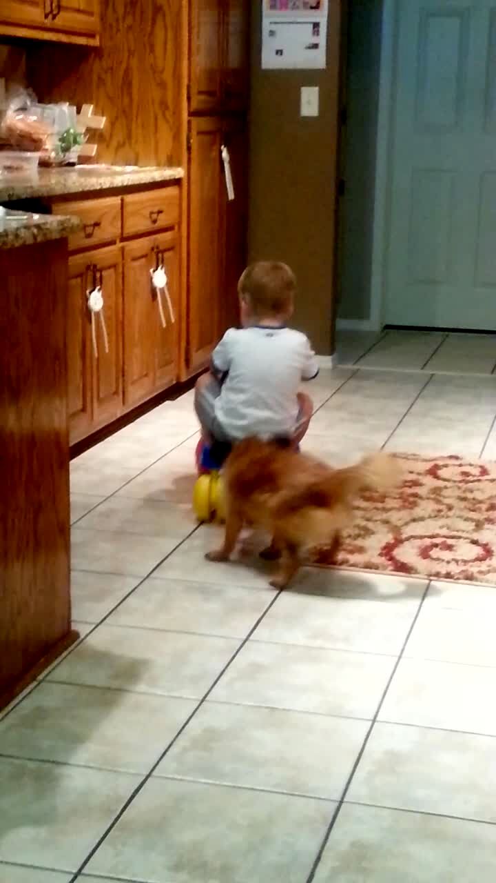 A tot boy holds a lizard outdoors. His dad tells him to kiss it, he does, and it bites him.