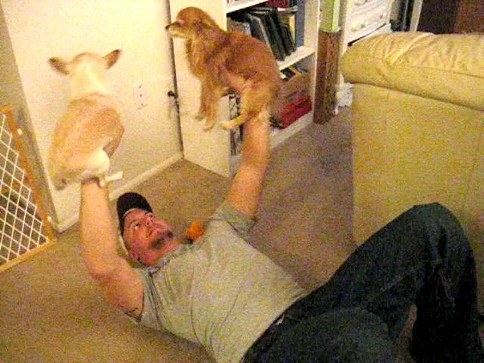 Man lifts weights - it's really his 2 chihuahuas. He bench presses the dogs. Exercise.