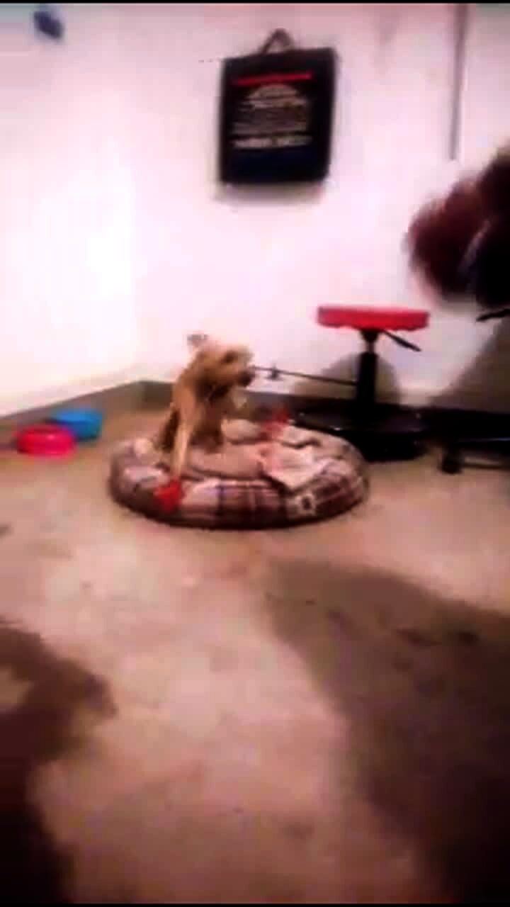 A person holds up a Chihuahua dog and it repeatedly shakes his head and makes a scream noise indoors. TikTok video.
