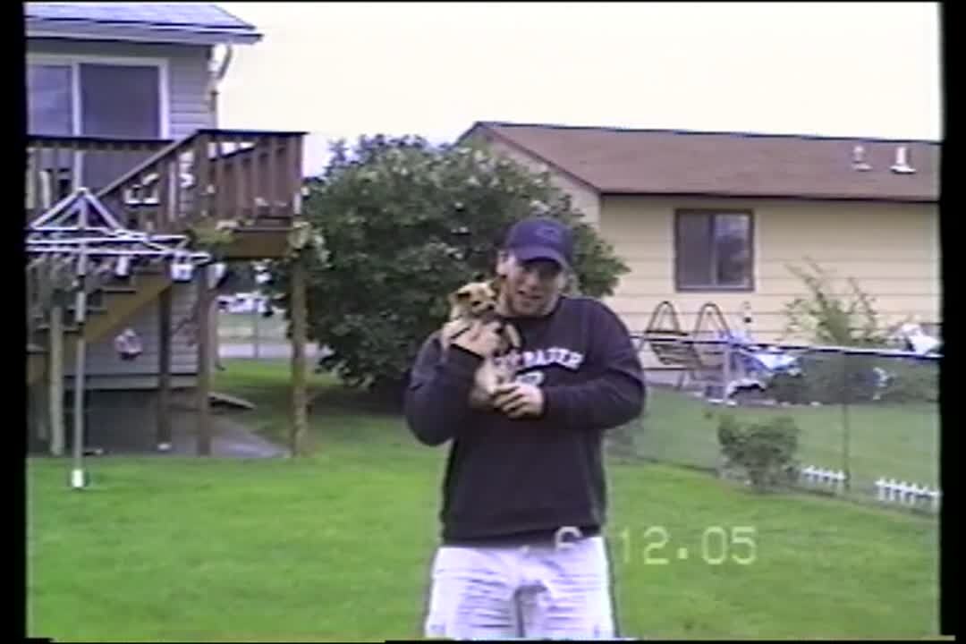 A small Chihuahua puppy dog runs around a man's head and neck while he sits in a living room chair. Featured talent cleared (the man).
