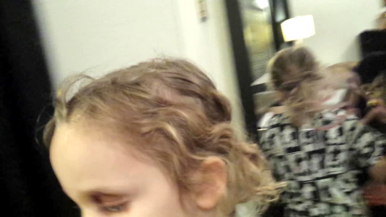 "Dad Hair Day" A man struggles to put a tot girl's hair into a pony tail at home. When he puts the band on her hair, it springs off and her hair pops up in two parts.