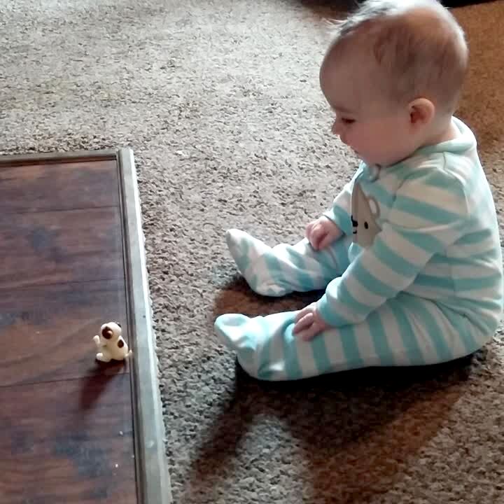 Infant laughs at flipping toy indoors.