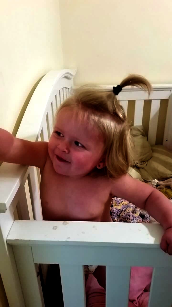 A baby tot girl turns her light on next to her crib and makes a shocked face. She turns it off and on again and continues to make a surprised face each time.