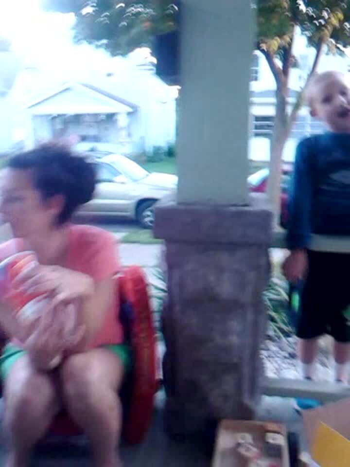 A baby boy makes a mess while eating ice cream in a highchair. His older brother pulls on a handrail on a porch, it breaks, and he falls backwards. "I'm okay."
