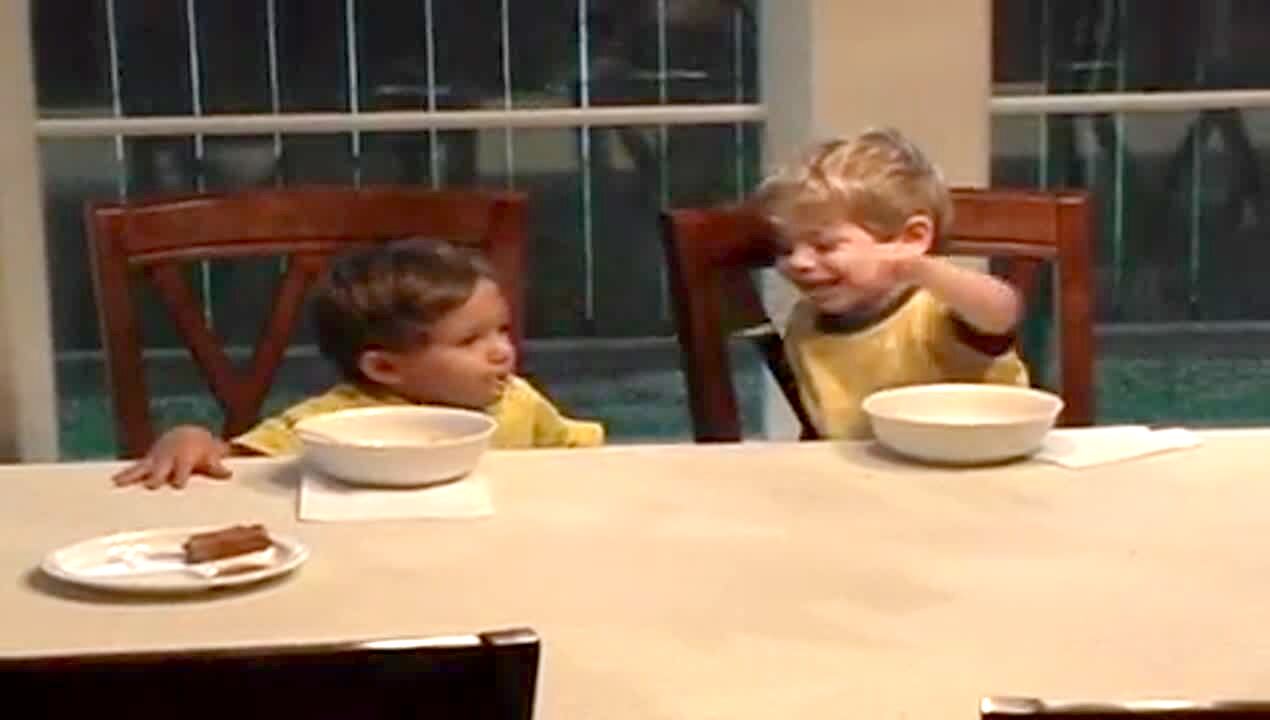 "Soup Spittin' Sibling" 2 tot boys share their food at the table, then tot boy on the left spits into the other boy's bowl. Gross.