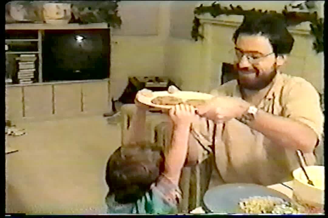 A young boy knocks a cake off the dining room table. When a woman asks the son how it got there, the son pretends he heard someone knock at the door. The son insists he can still eat it and eats it off the floor.