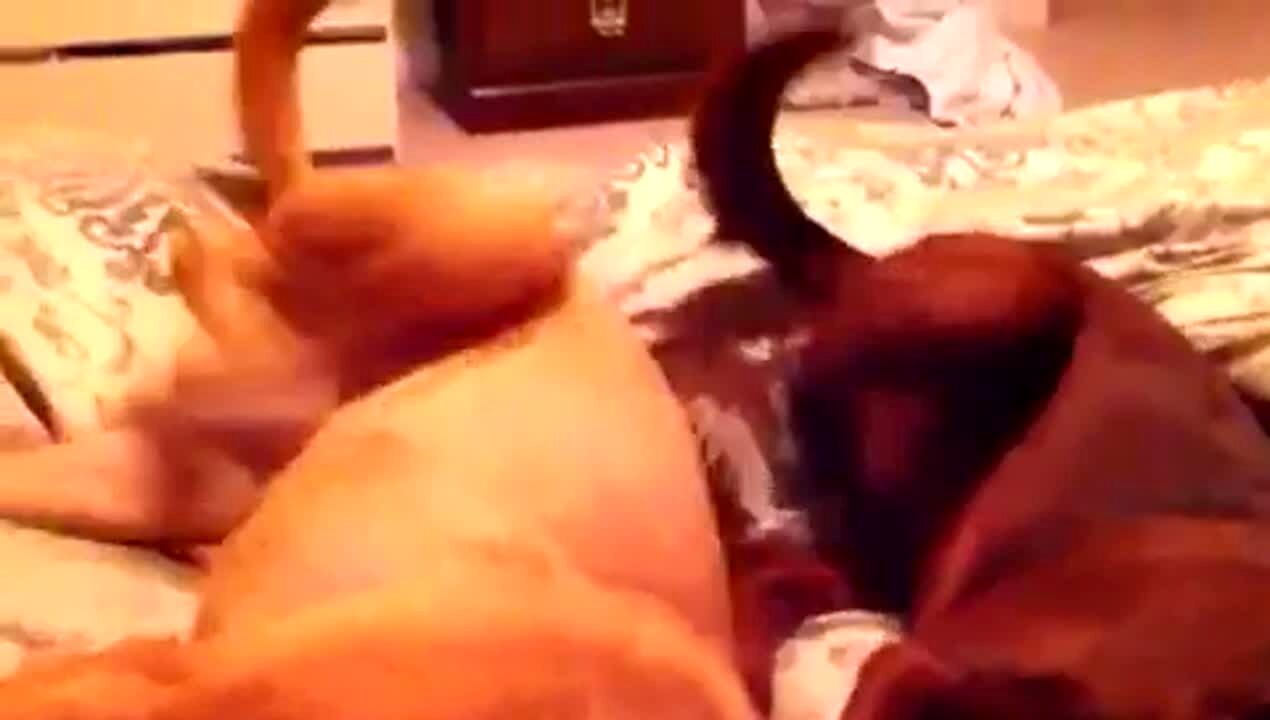 A woman pets/ scratches a brown dog on a bed and its leg twitches. Its twitching leg then scratches a tan dog's back and makes that dog's leg twitch.