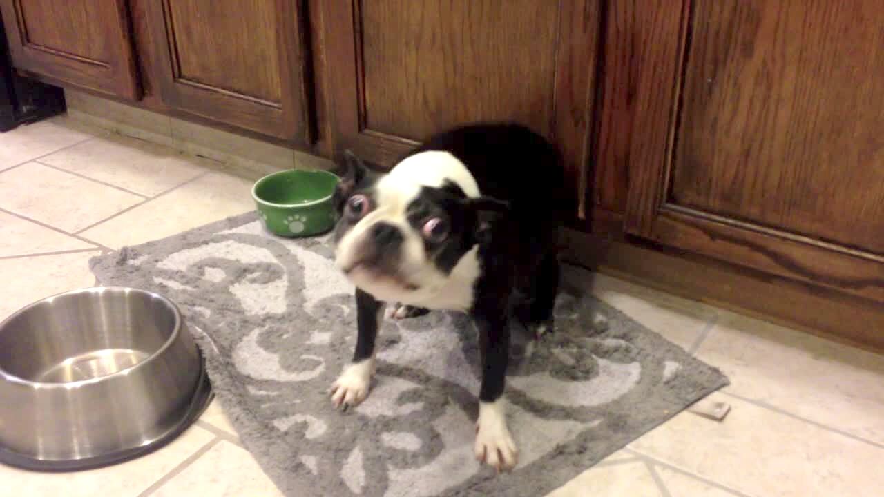 A Boston Terrier dog stretches out and rubs her stomach back and forth on the living room floor.