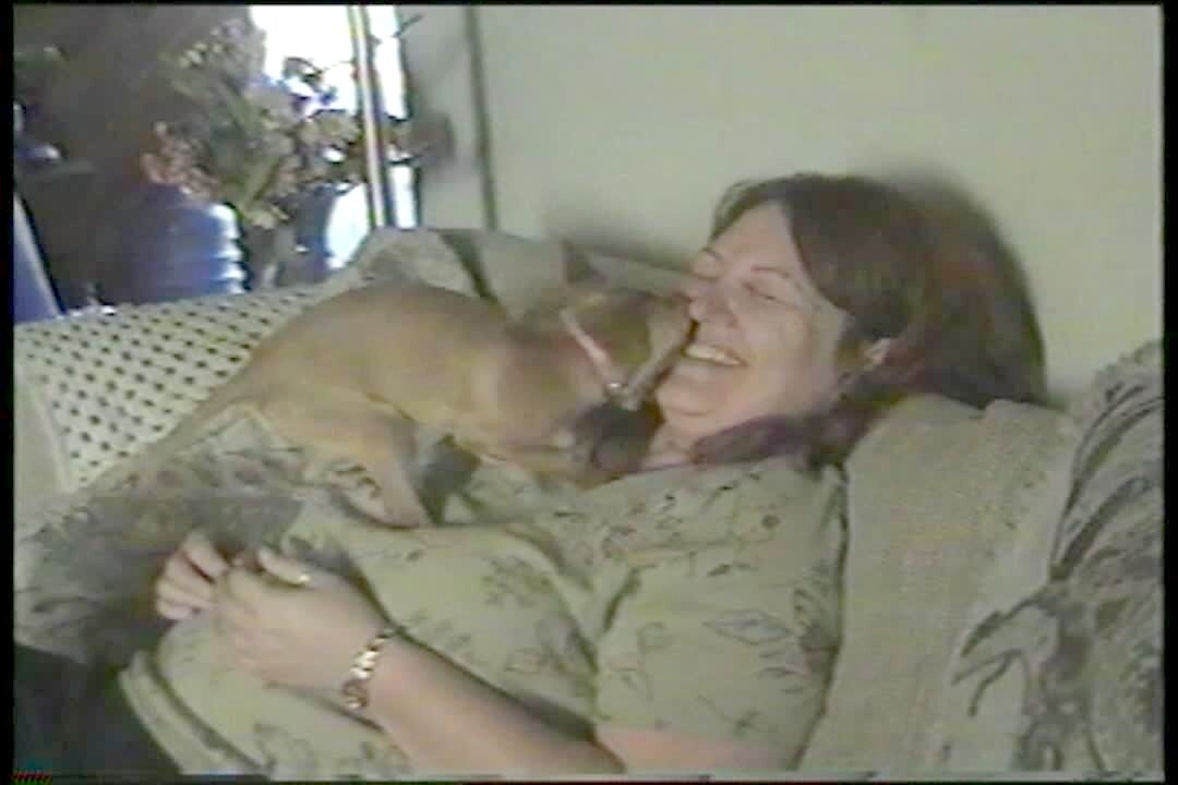Small chihuahua dog rubs its face & body all over woman's face. Woman just sits on the couch. Weird pet.