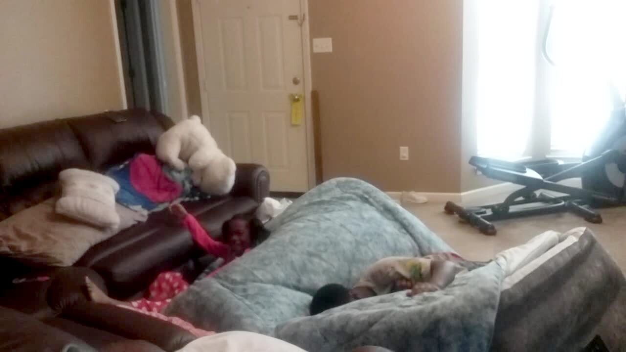 A light cover falls from the ceiling after a teen girl jumps on an air mattress and bounces a young girl in to the ceiling.