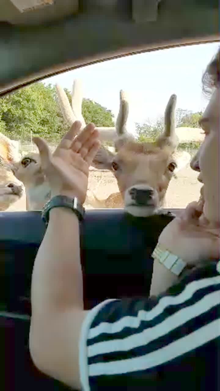 A teen boy feeds deer at a drive through safari park and is scared and his young brother screams when a buffalo comes up and sticks his head in the car.