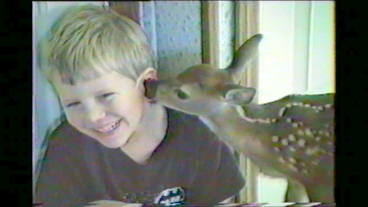 Deer walks into a house & wanders around the living room with a boy. Deer looks at household items & starts eating things. Long for edit.