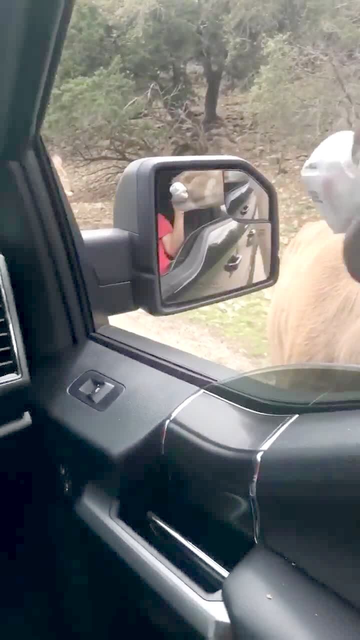 A man feeds a llama from a bucket through the window of an automobile at a drive-through safari. As the vehicle drives the llama runs beside the vehicle and the man says "Let's goooo!"