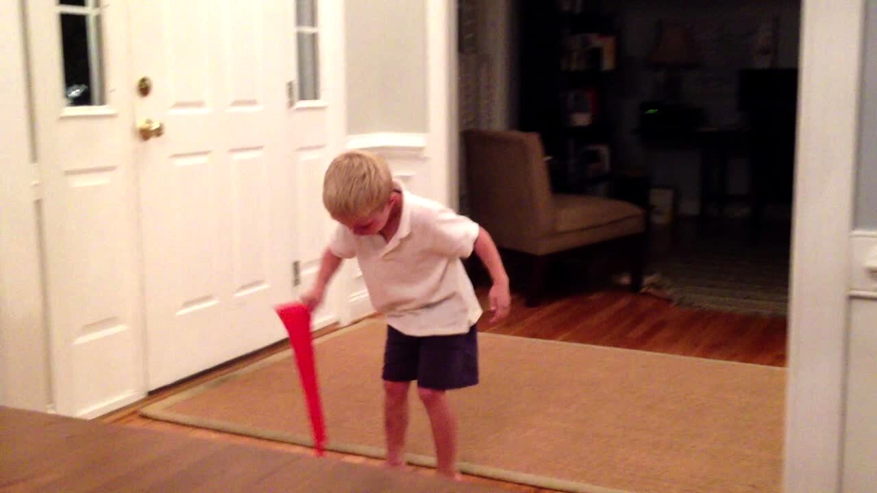 Boy, at indoor toy basketball hoop, goes for shot, backboard falls, hits boy on his head. REDUB, Should have all footage.