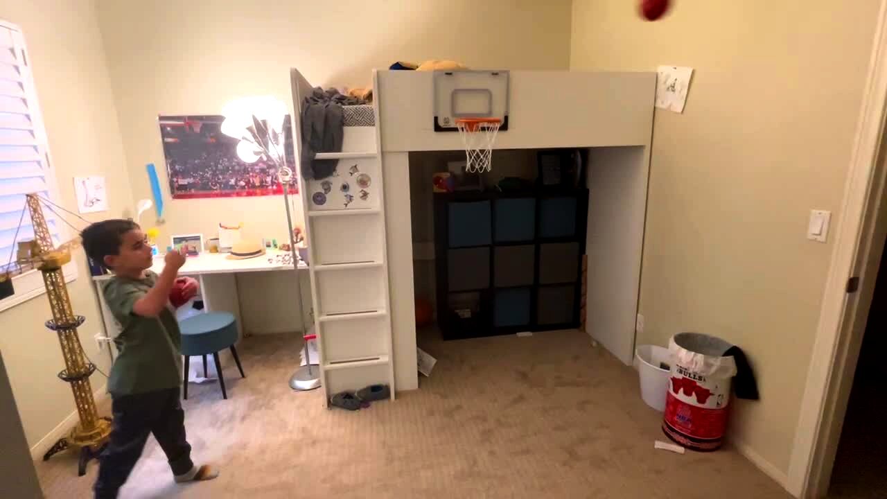A young boy attempts to toss a small basketball against his bedroom wall and bounce it into a mini-hoop. The ball falls short. He kicks the ball straight up and into the hoop. He looks at the camera.