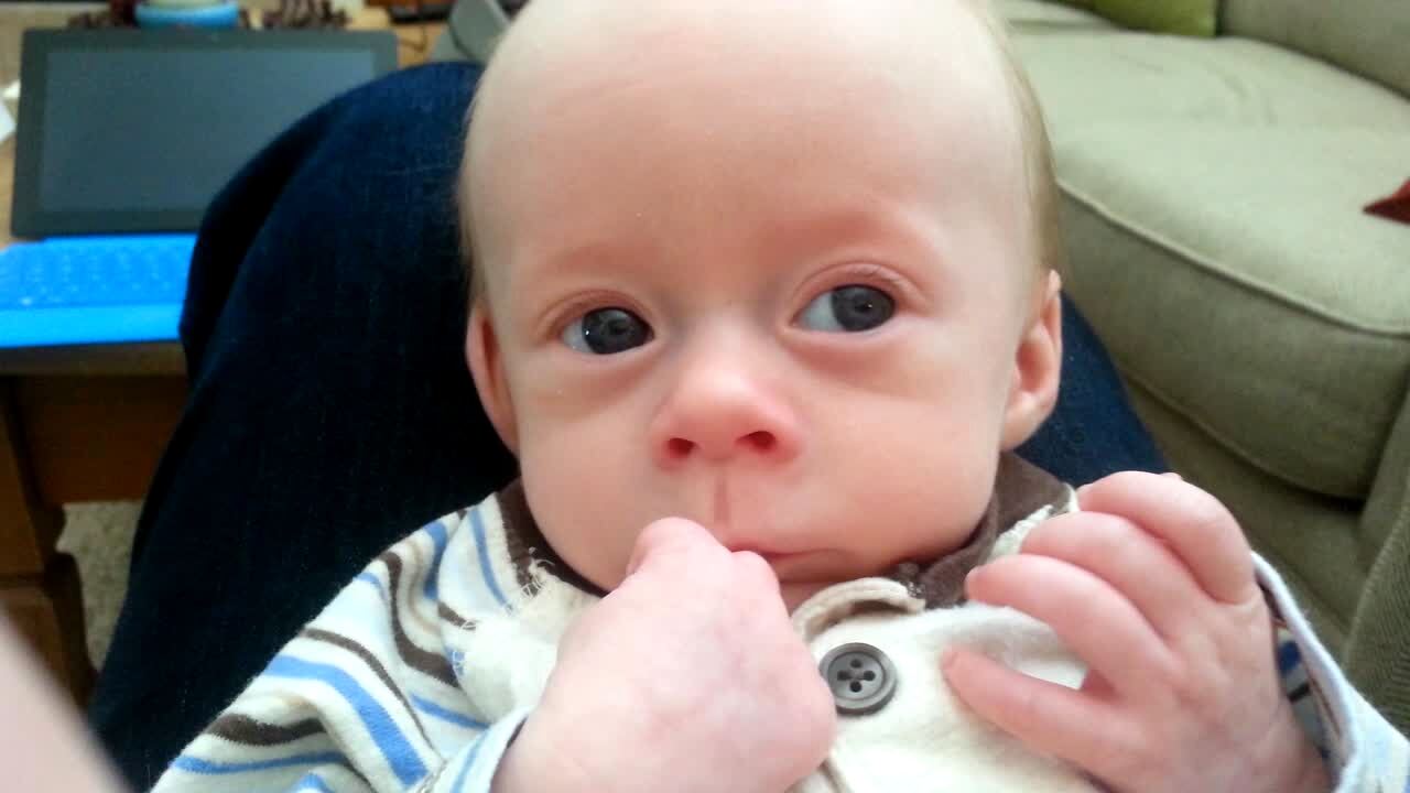 A baby boy strains to poop at home and milk shoots out of his nose.