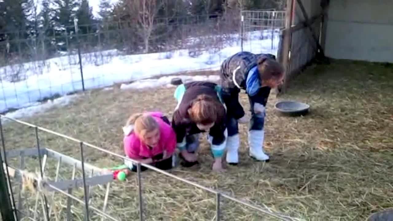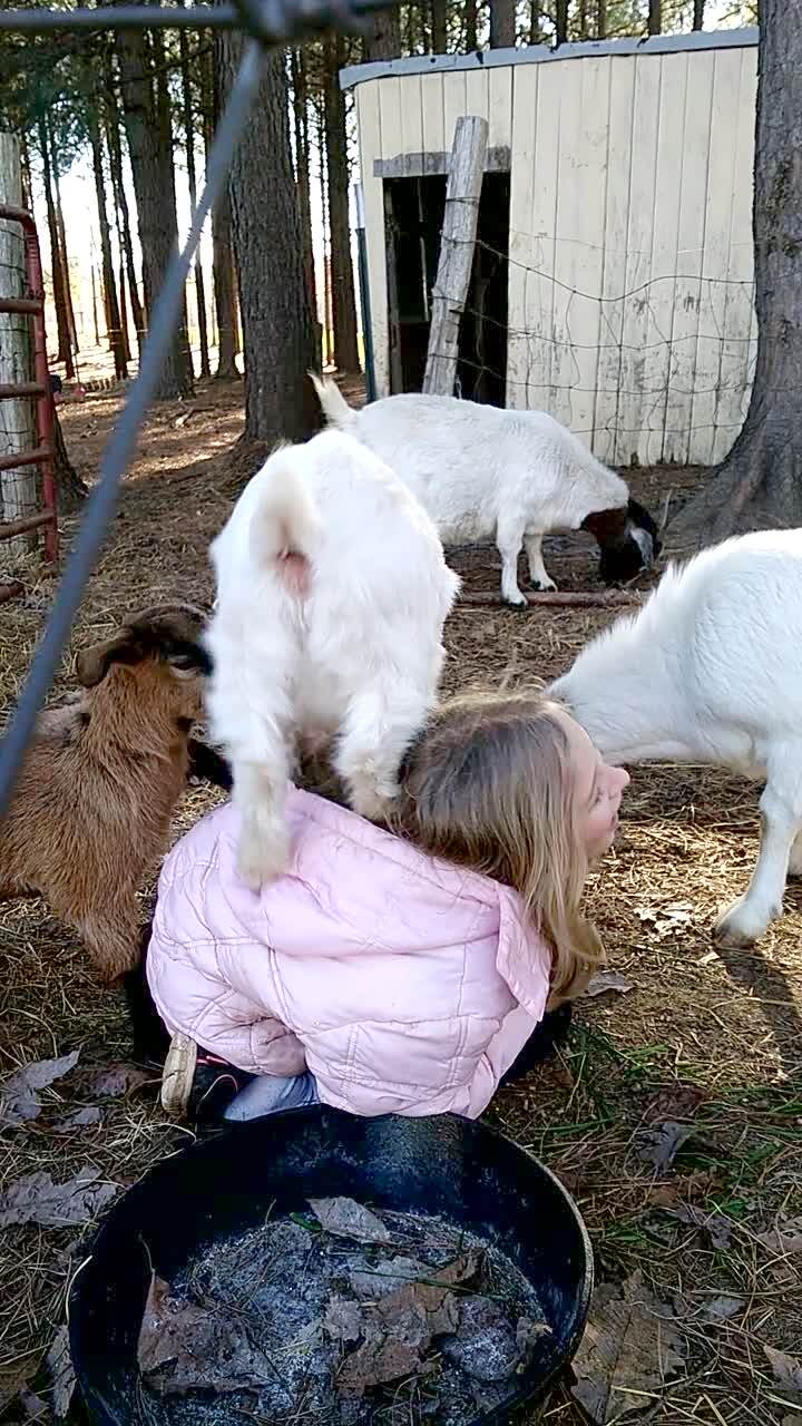 Baby goats jump/climb on a young girl repeatedly while she kneels in their pen. A dog howls off camera.