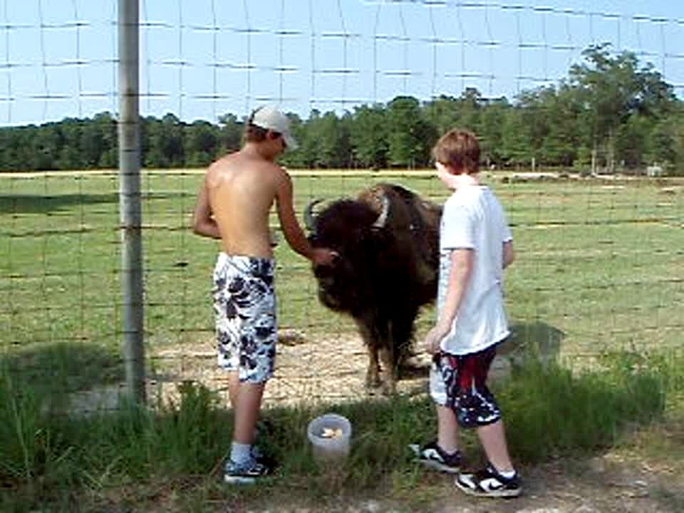 A young boy pets a goat outside as a woman says, "Pet her some more. She's nice, see?" As he pets her some more, the goat headbutts her.