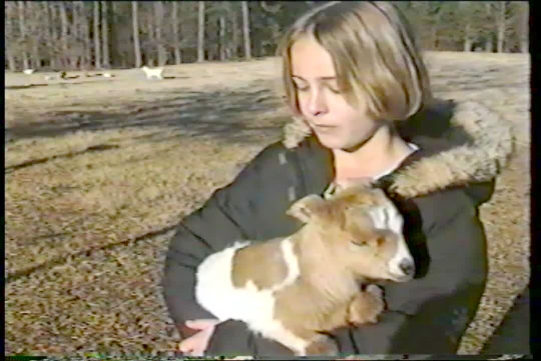 A teen girl holds a baby goat up and the goat screams twice.