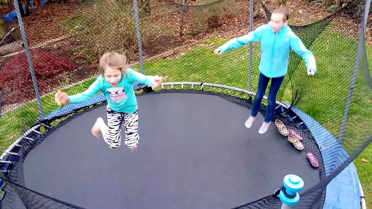 Two young girls jump/ flip on a trampoline outdoors and say "Berg Tomeron. Oops, I mean, Tom Bergeron!" Introductions.