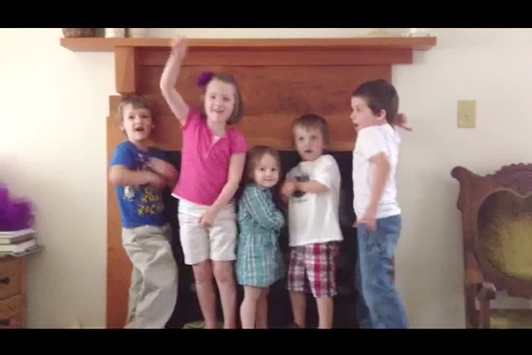 Five kids stand in front of a fireplace and introduce TomL "Tom Bergeron...yay!"