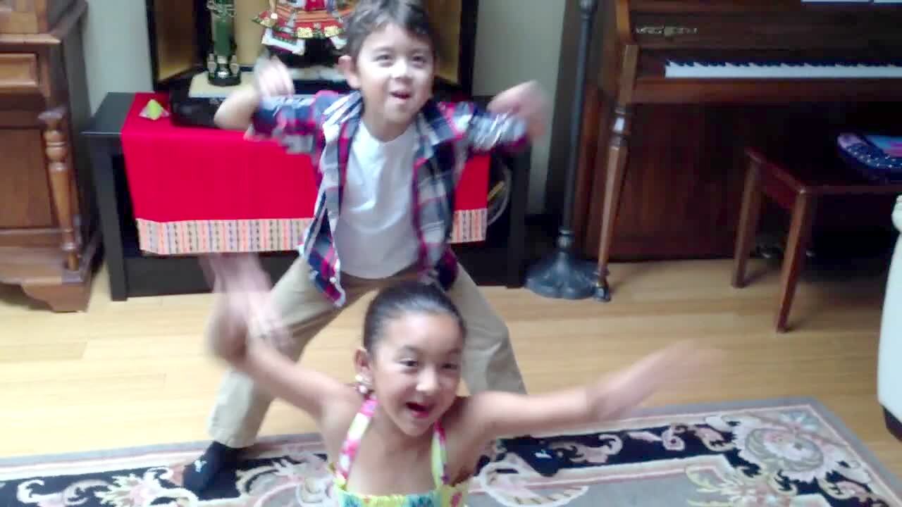 A young boy and girl say "Tom Bergeron!" in front of a fire place after a failed attempt false start indoors. Introductions