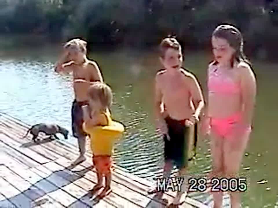 4 kids stand on dock over lake & boy says they'll all jump in backwards. The littlest girl with a life jacket on falls into the water. Short tail.