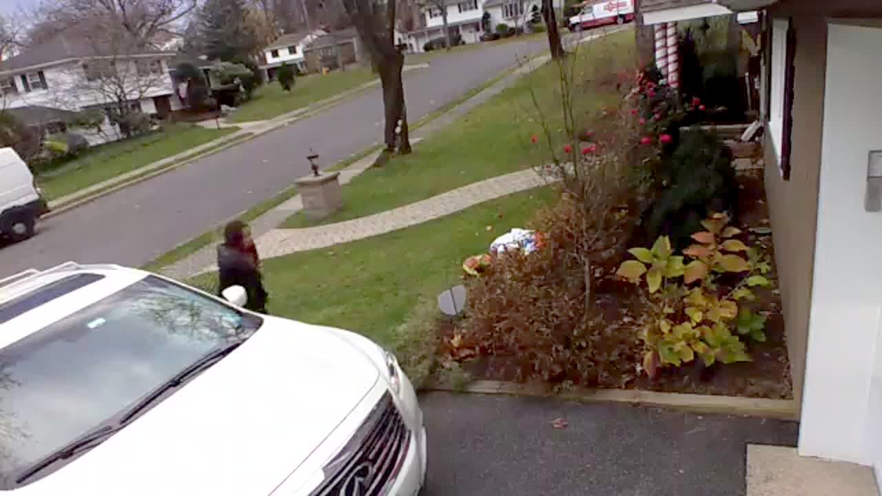 A woman gets out of her car and walks to a front door. Her car rolls backwards down the driveway and she runs off camera to catch it. No audio.