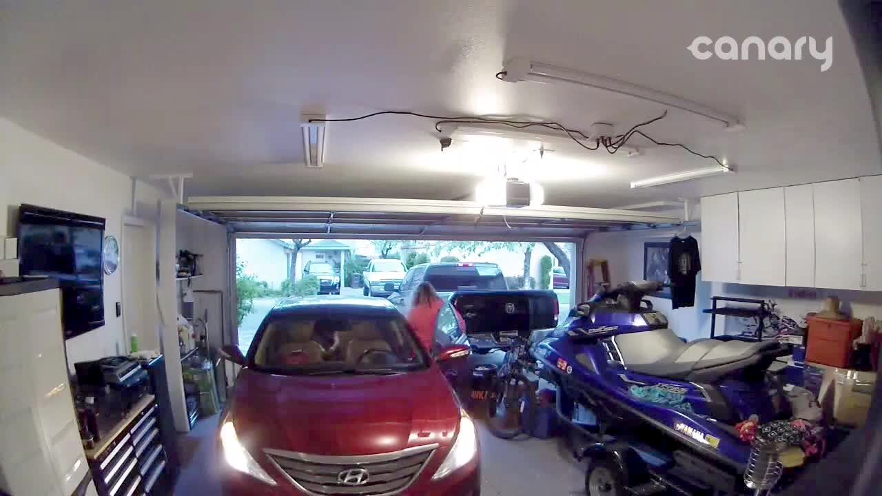 A woman gets out of car in the garage. The car is still in neutral and rolls down the hill. The next two clips show the car continue out of the driveway and into a park from different camera angles. There is a voiceover of a man laughing. Security camera screen recording