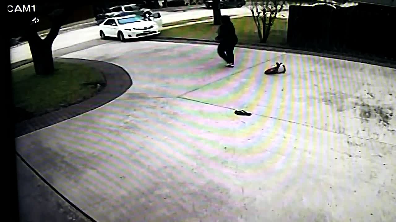A woman gets out of a vehicle in a snowy driveway and forgets to put it in park, as she then chases after the car after she hands someone her toddler. Security footage.