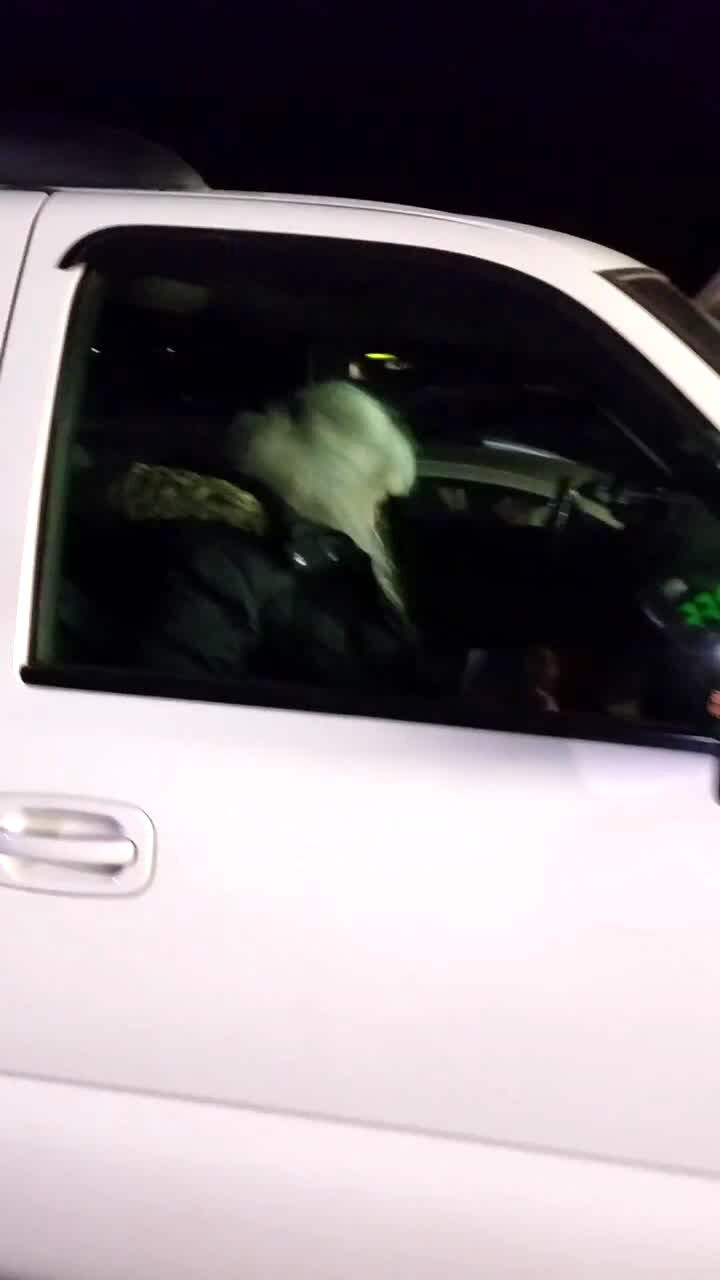 A woman records a video while she walks down the sidewalk to a parked car that honks its horn. She goes up to the window and sees a dog in the driver seat with its paw on the horn.