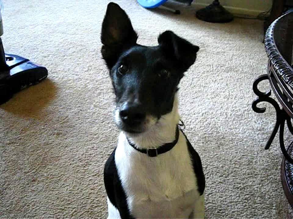 Black and white dog with one ear cocked tilts head mechanically as woman asks questions in living room.
