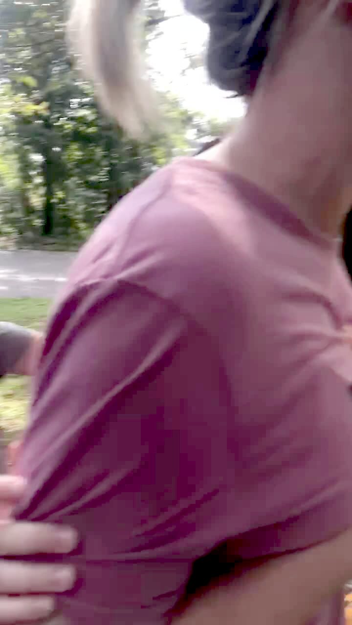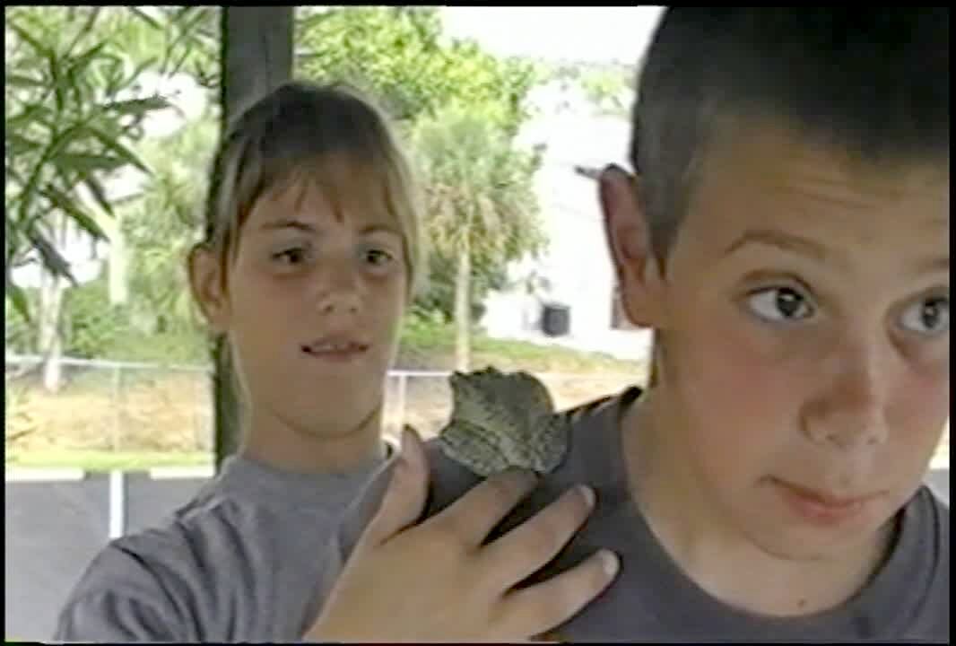 A frog crawls on a young boy's arm and back outdoors and he holds his arm out to a tot girl, who looks at the frog and tries to touch it when it jumps off the boy and onto her head and she screams. Scare.