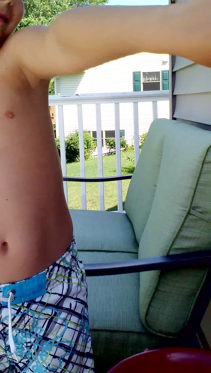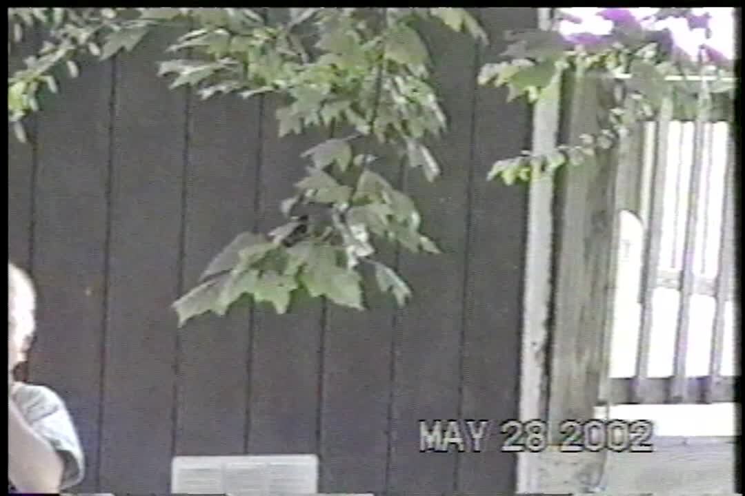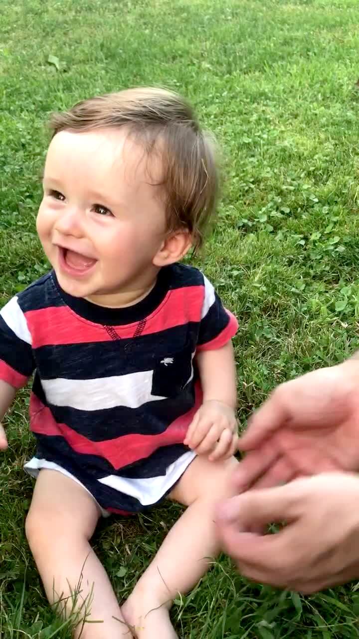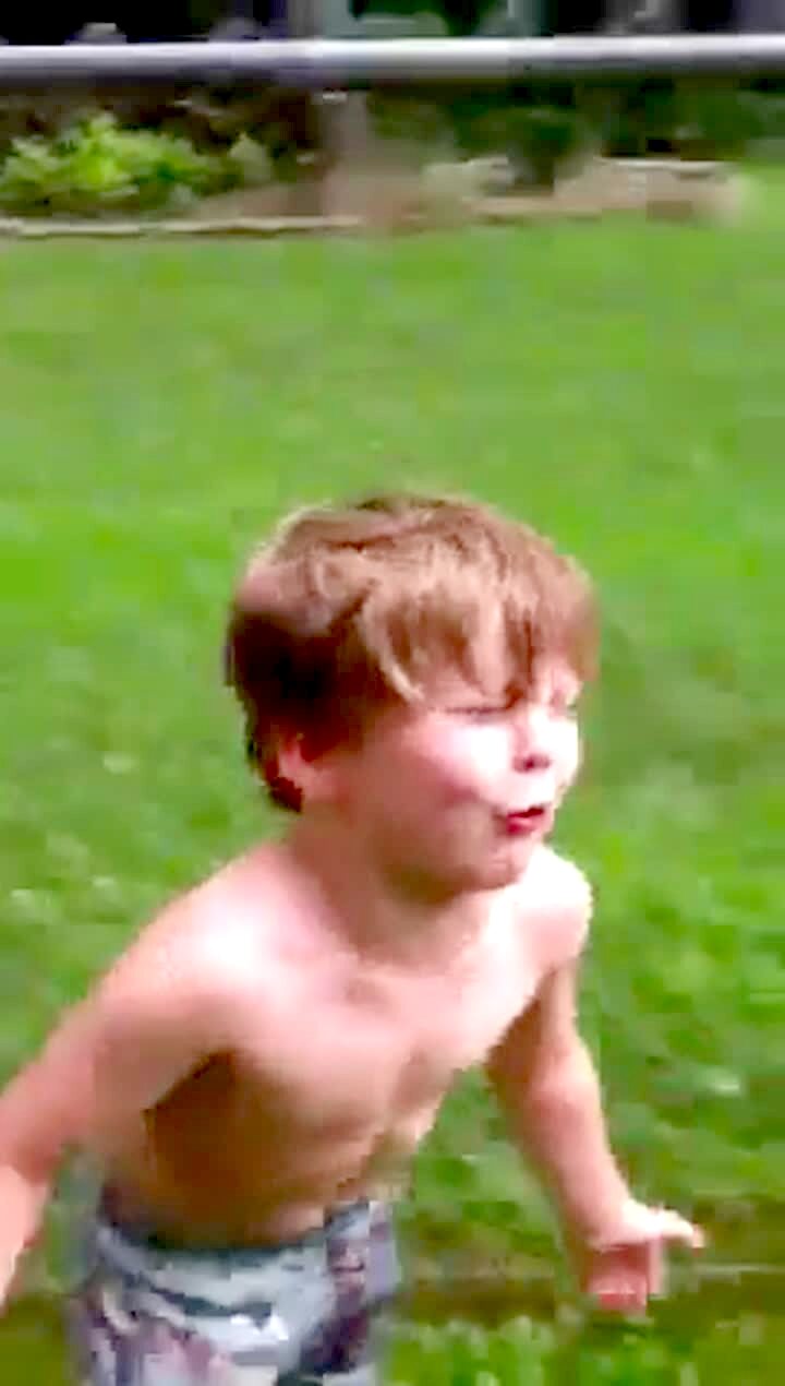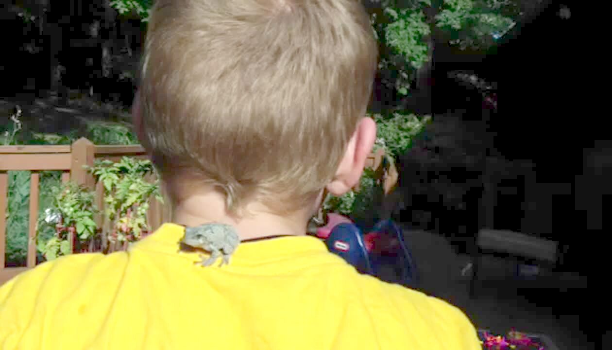 A tot boy stands on a backyard porch and touches a frog, but is scared. It jumps on his head and he screams "get it off". His dad laughs hysterically, and the boy laughs and high-fives him.